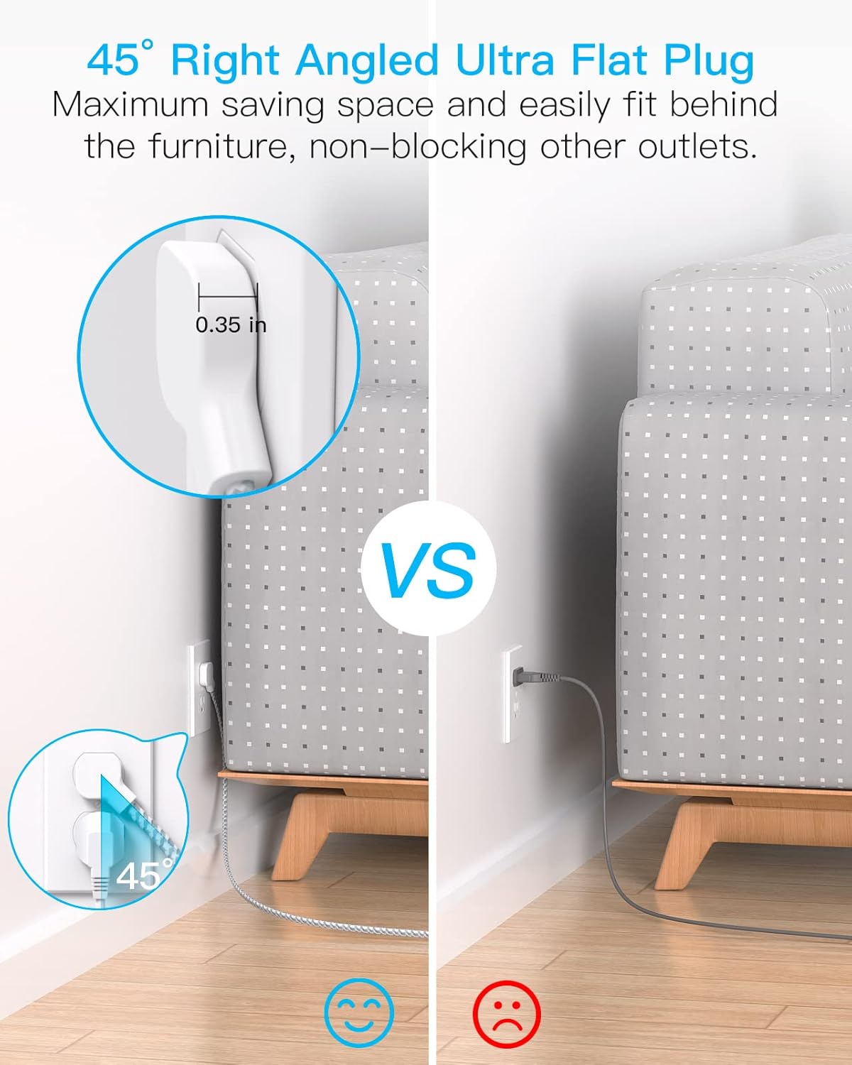 0.35 inch low profile flat head, One Beat power strip flat plug can be easily hidden in the back of furniture, bed and refrigerator, which can maximum save your occupied space.