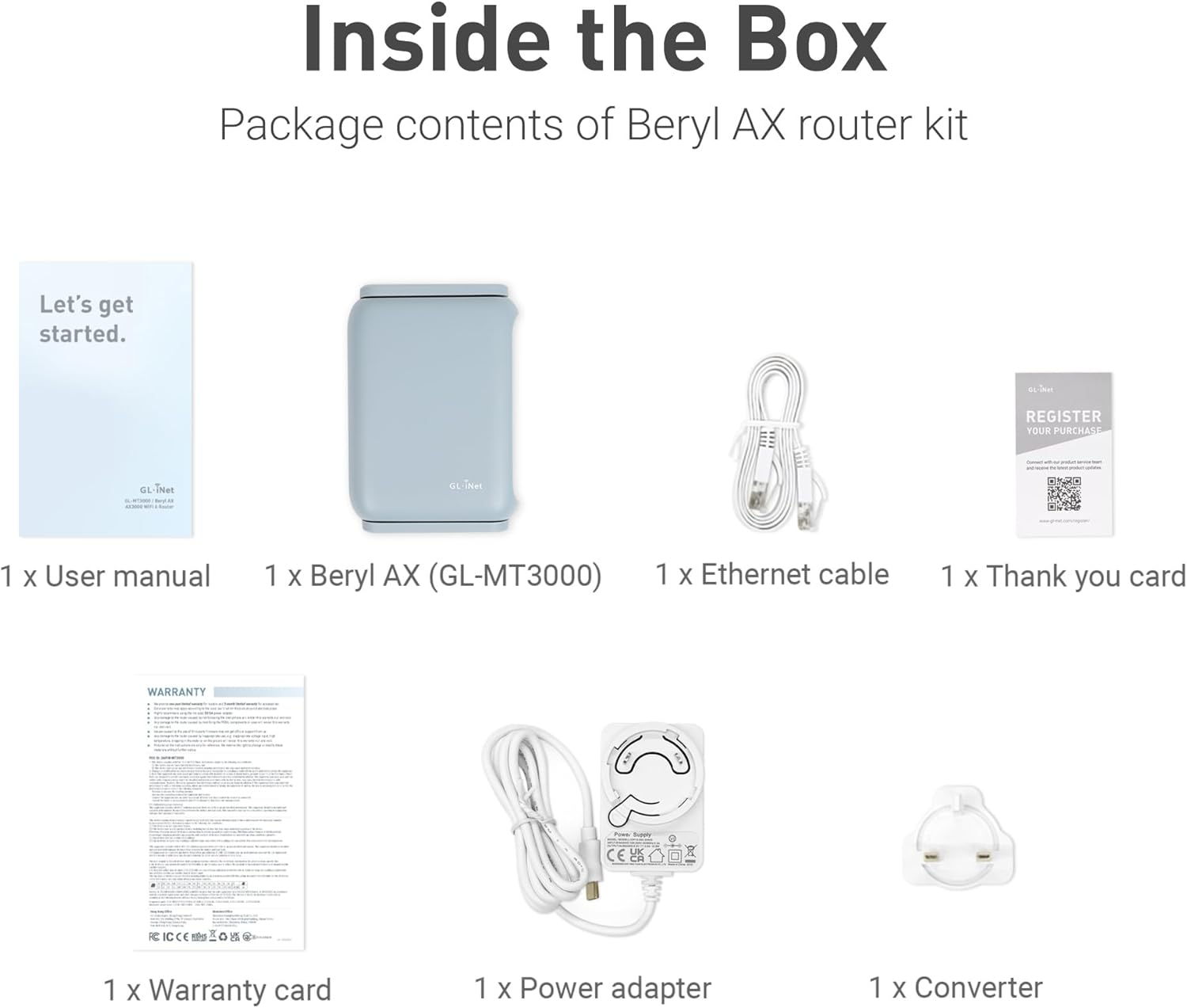 【DUAL BAND AX TRAVEL ROUTER】MT3000 wifi 6 router packs with US, UK, EU Plug; Dual band network with wireless speed 574Mbps (2.4G)+2402Mbps (5G); Tethering Compatible; 2.5G Multi-gigabit WAN port and a 1G gigabit LAN port; USB 3.0 port; WIfi 6 offers more than double the total Wi-Fi speed.