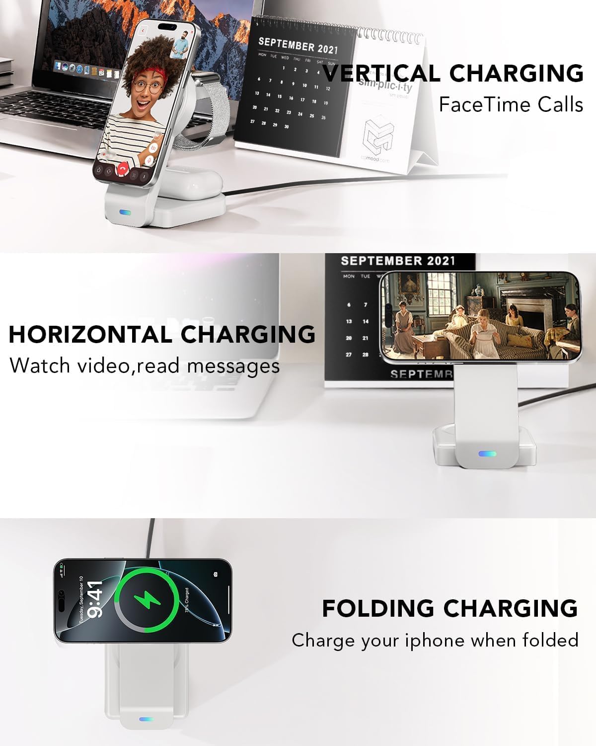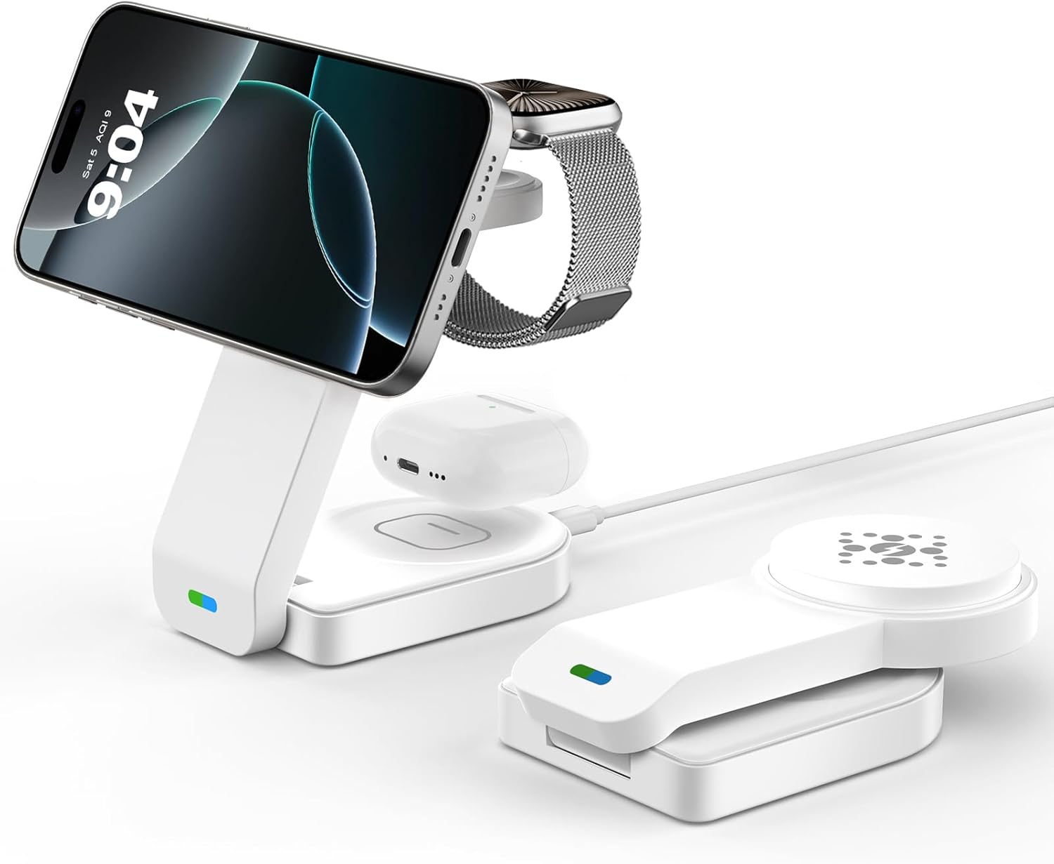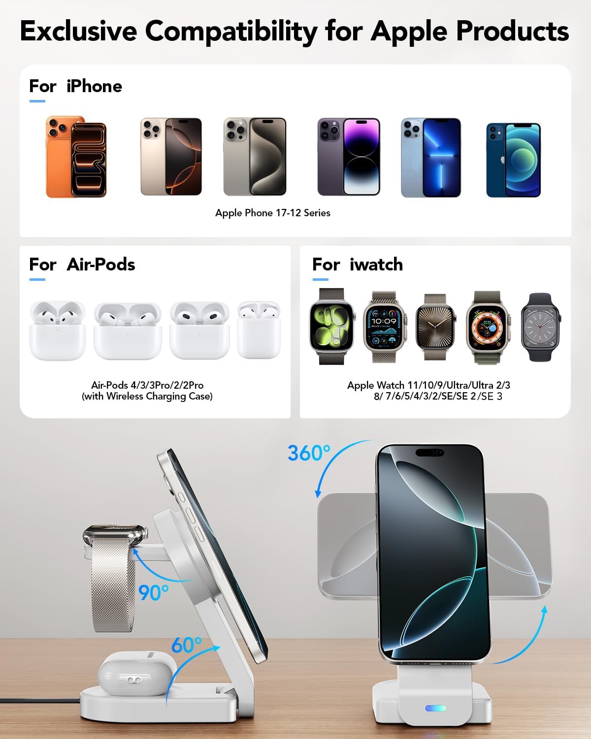 【Wide Compatibility】Designed with a lightweight and compact design, the Apple charging station can be folded and stored in the storage bag for easy carrying. Compatible with iPhone 17/Air/17 Pro Max/17 Pro/16/16 Plus/16 Pro Max/16 Pro/15/15 Plus/15 Pro Max/15 Pro/14 pro max/14 pro/14 plus/14/13 pro max/13 Pro/13/13 mini/12 Pro Max /12 pro/12/12 mini and iWatch 11/10/9/8/7/6/5/4/3/2,Ultra 3/2/1, iWatch SE 3/2/1; Air-pods 4/3/2 Mag-Safe version, Air-pods pro 3/2.