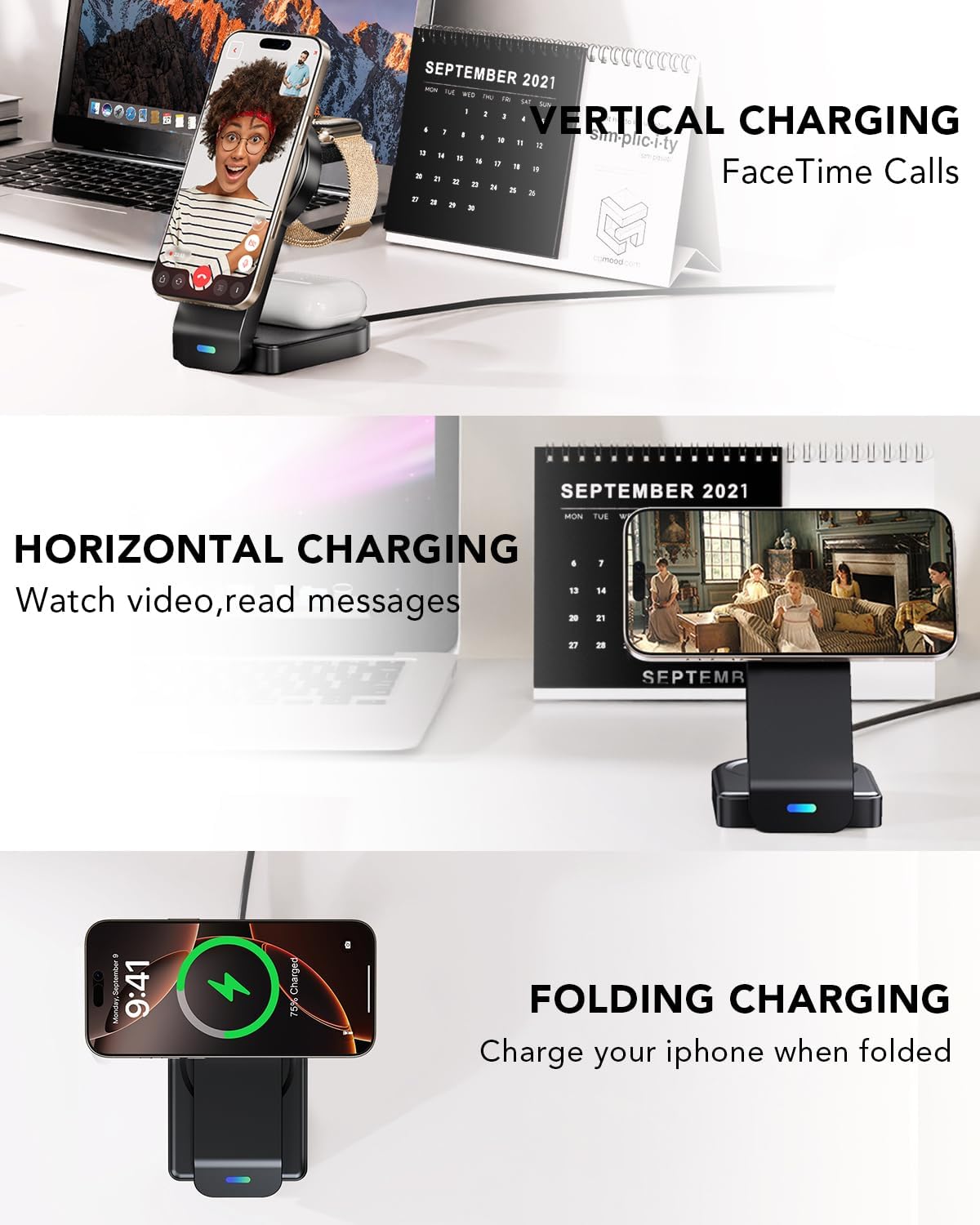 【Wide Compatibility】Designed with a lightweight and compact design, the Apple charging station can be folded and stored in the storage bag for easy carrying. Compatible with iPhone 17/17 Pro Max/17 Pro/Air/16/16 Plus/16 Pro Max/16 Pro/15/15 Plus/15 Pro Max/15 Pro/14 pro max/14 pro/14 plus/14/13 pro max/13 Pro/13/13 mini/12 Pro Max /12 pro/12/12 mini and iWatch 11/10/9/8/7/6/5/4/3/2,Ultra 3/2/1, iWatch SE 3/2/1; Air-pods 4/3/2 Mag-Safe version, Air-pods pro 3/2.