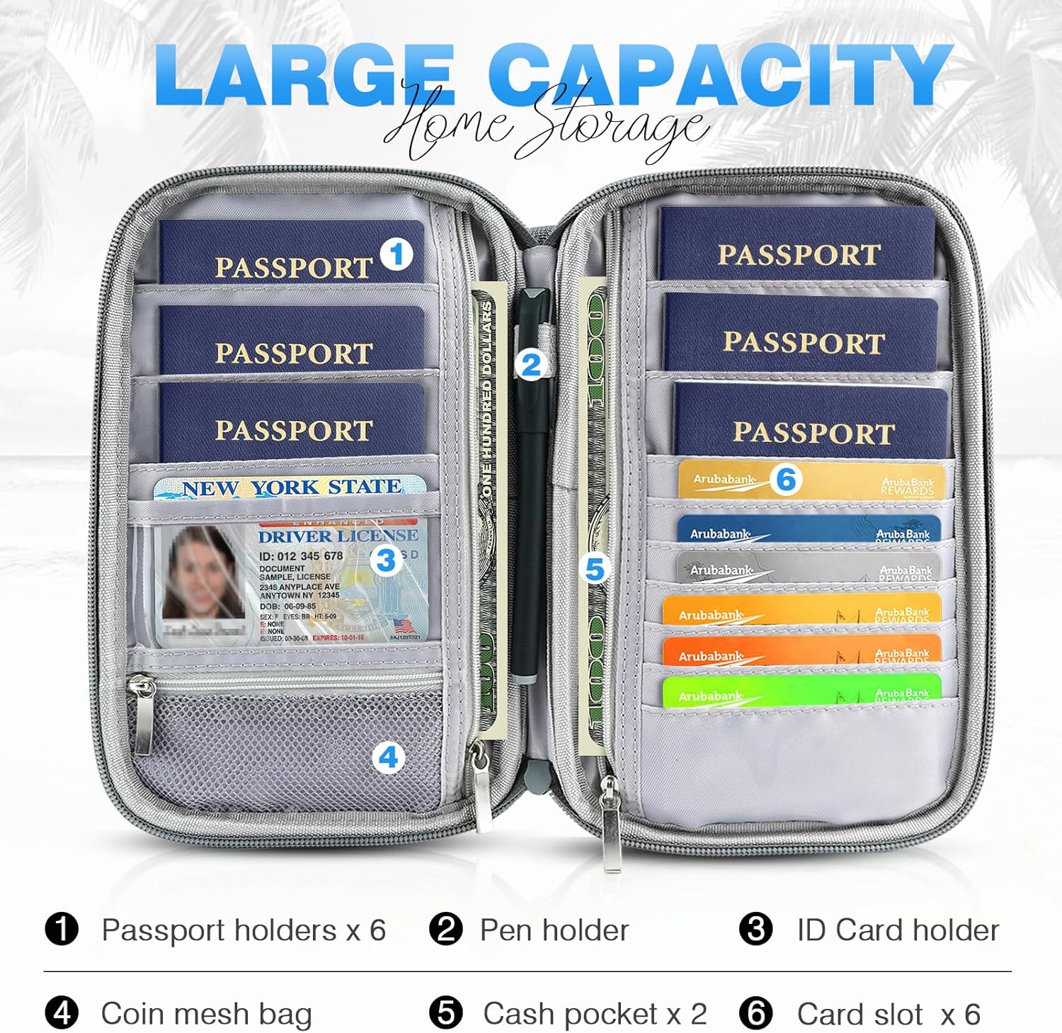 【Rfid Blocking Protective passport bag】Family passport holder for 1 2 3 4 5 6 can effectively protect your card from being scanned, including 4+2 passport pockets, 1 boarding pocket sleeve, 1 transparent pocket, 1 quick access pocket, 1 pen holder, 2 zipper cash pockets, 6 Card slots, a coin mesh pocket and detachable key chain.