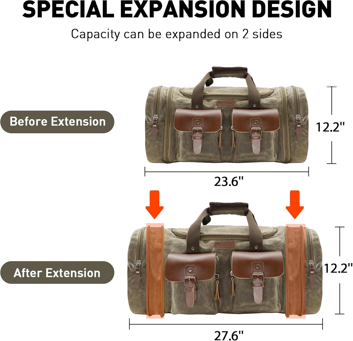 【Large and Expandable Capacity】You will be surprised at the size of this travel bag. Regular dimensions are (L)23.6 x (W)11 x (H)12.2 inches (50L). Extends to (L)27.6 x (W)11 x (H)12.2 inches (60L). The internal capacity is large enough to store clothes and travel essentials for 7-9 days. Can also be used as a carry-on flight bag.